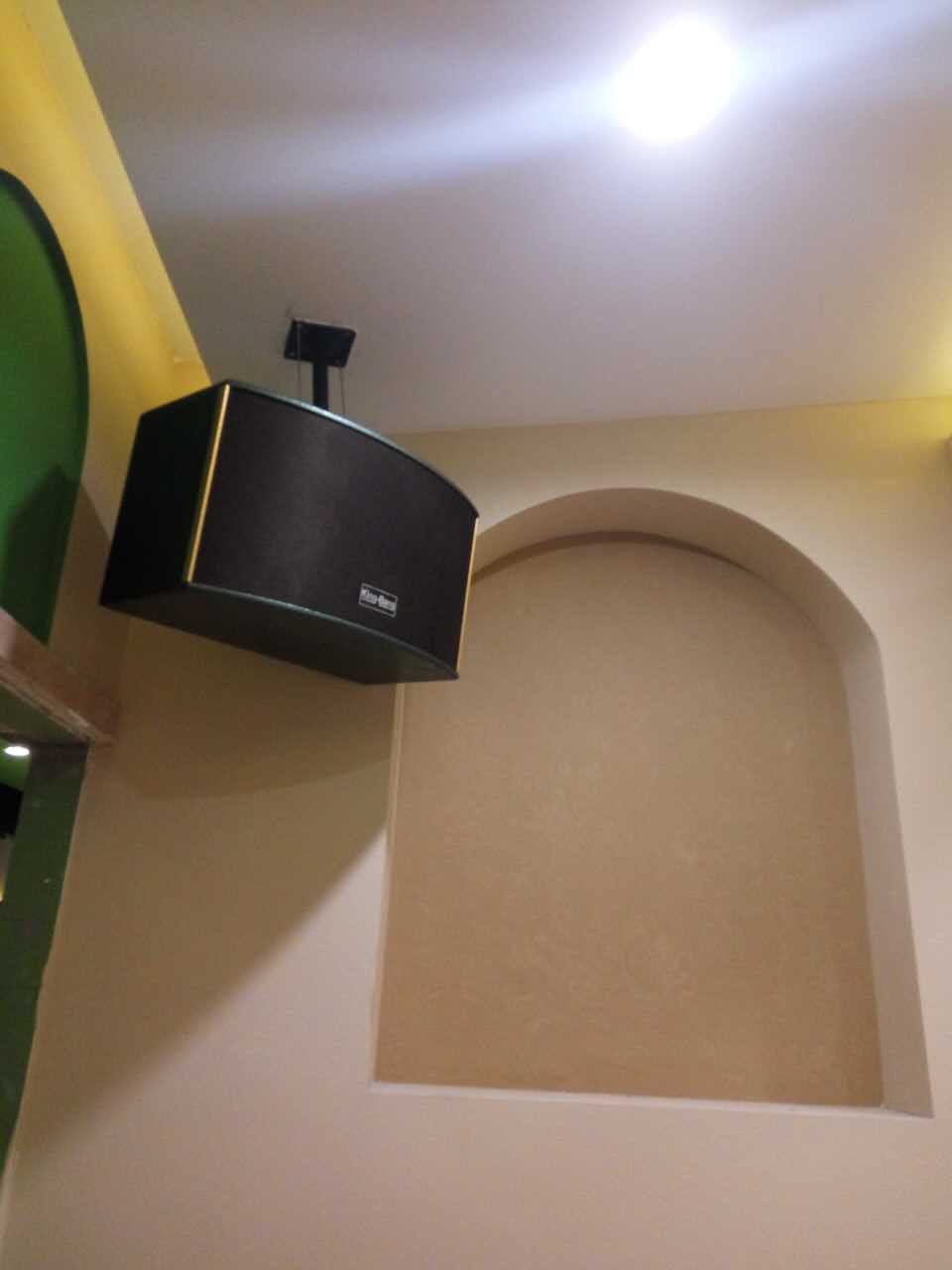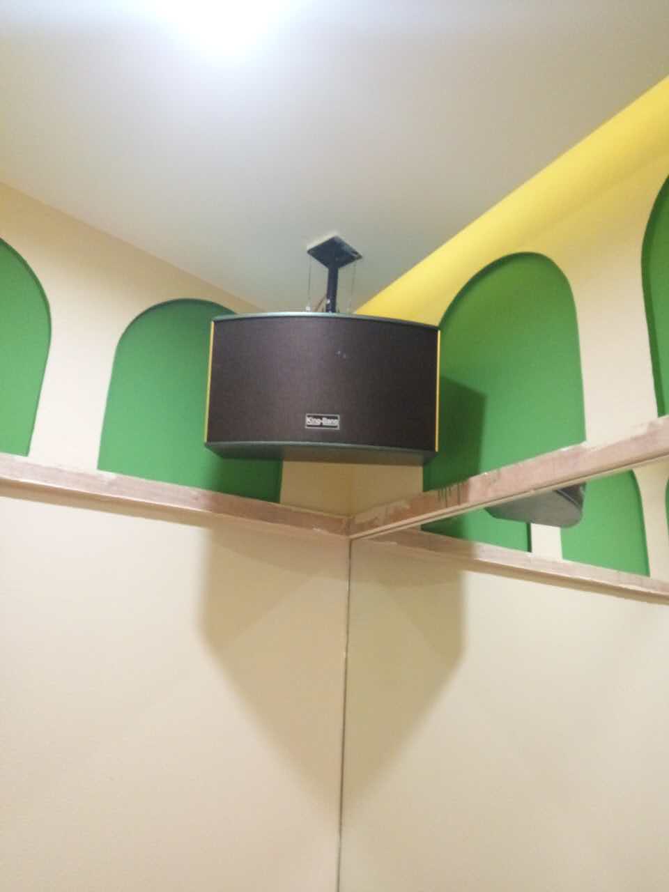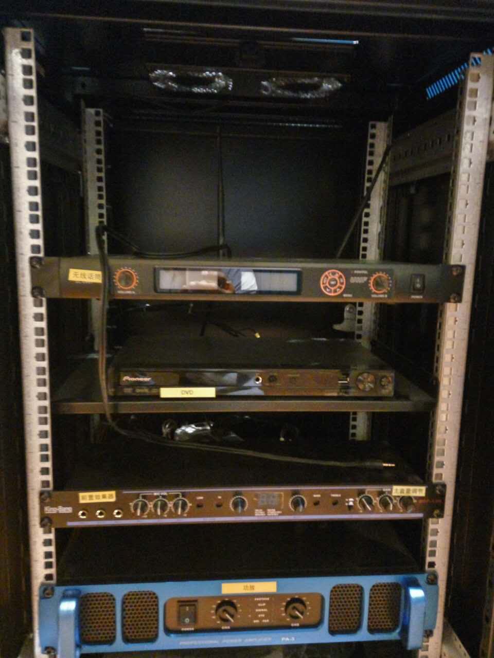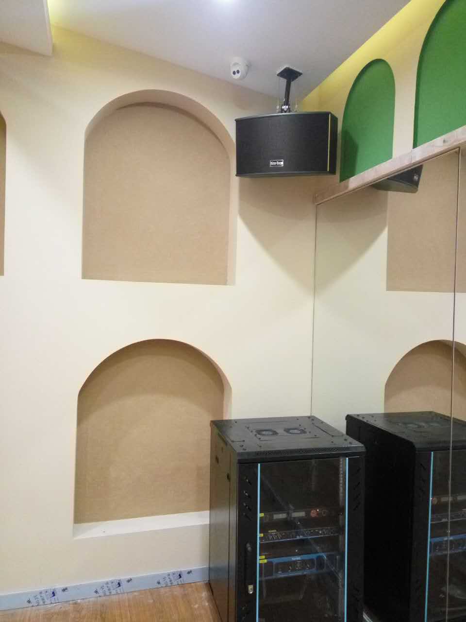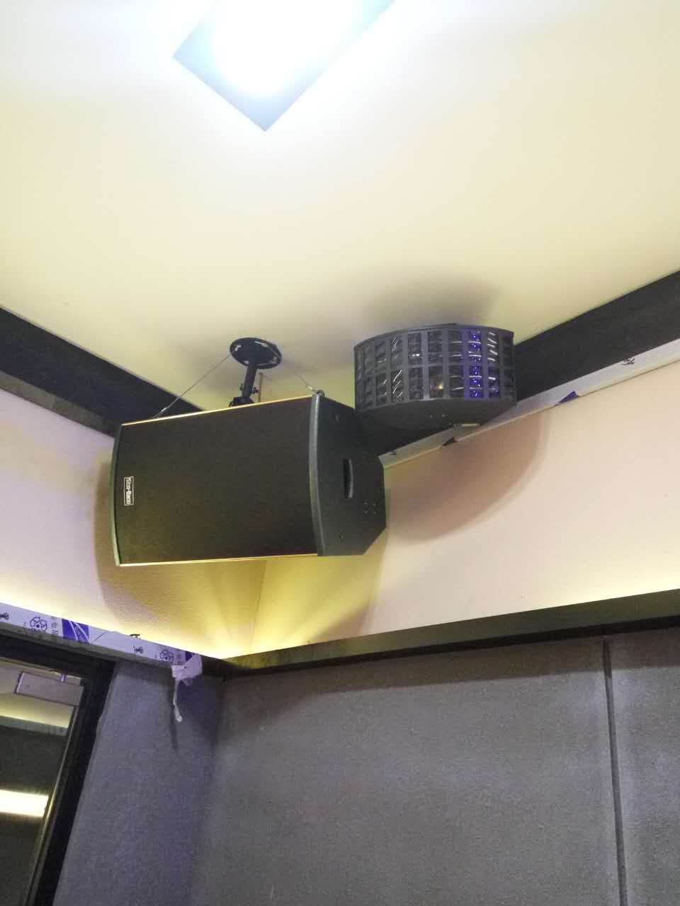 整個(gè)系統(tǒng)包括KT-10的兩分頻單10"卡包箱以及S-166的優(yōu)質(zhì)的天花喇叭,所有音箱由兩臺(tái)K-7500合并式功放500W,DSP-100的專業(yè)數(shù)碼HI房卡拉OK前級(jí)。整個(gè)系統(tǒng)主要用于背景音樂的播放。