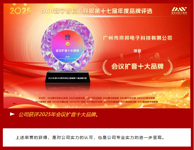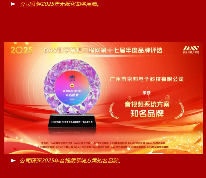 【喜報】京邦電子榮獲2025年度DAV數字音視工程網三大權威獎項,助力贏得市場矚目